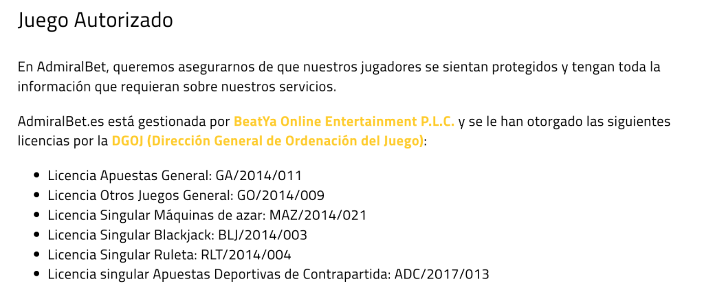 - Descripción: Esta licencia permite a AdmiralBet Casino operar legalmente en España, asegurando que cumpla con todas las regulaciones locales específicas, incluidas las relacionadas con la publicidad de apuestas, el juego responsable y la protección de los jugadores vulnerables.