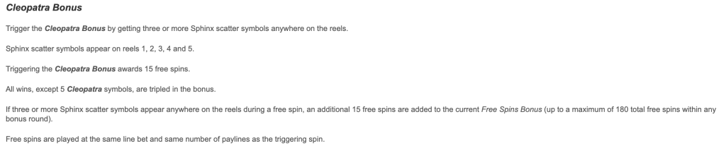 Una de las cosas más interesantes que puedes comprobar en la demo del juego de tragamonedas gratis Cleopatra, es que cuenta con una dinámica de Bonos de tiradas gratis de lo más movidita en torno al símbolo de la Esfinge, que hace de Scatter. La cosa funciona así: si sacas 3 o más te recompensan con entre 15 y 180 tiradas gratis en las que todos los premios que consigas se triplican automáticamente (excepto si sacas 5 símbolos de Cleopatra).