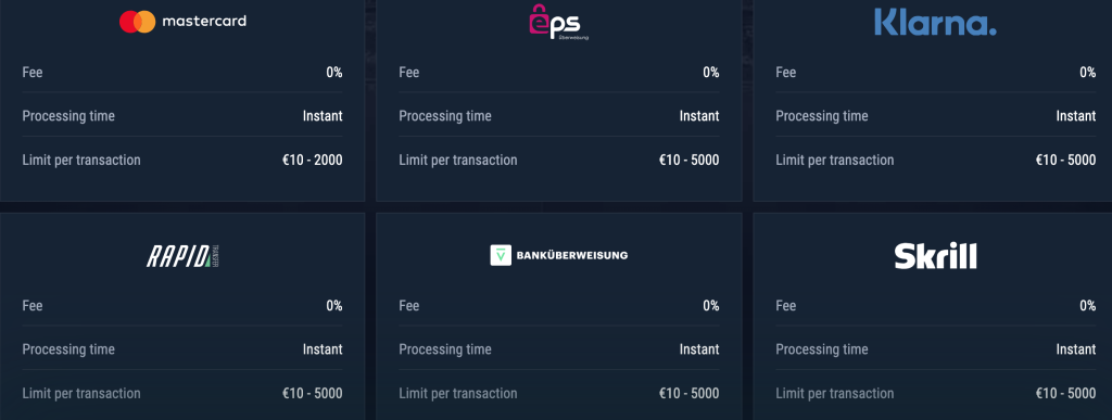 | Método de Pago | Tiempo de Procesamiento Depósito | Tiempo de Procesamiento Retiro | Límite de Retiro Mensual |