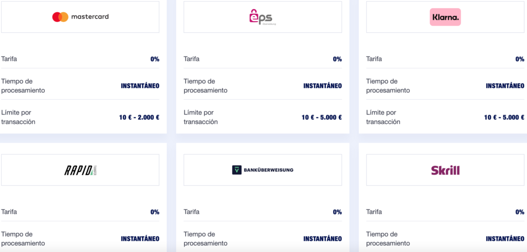 Método de PagoTipoDepósito (Sí/No)Retiro (Sí/No)Tiempo de Procesamiento de RetiroLímites (Mínimo/Máximo)