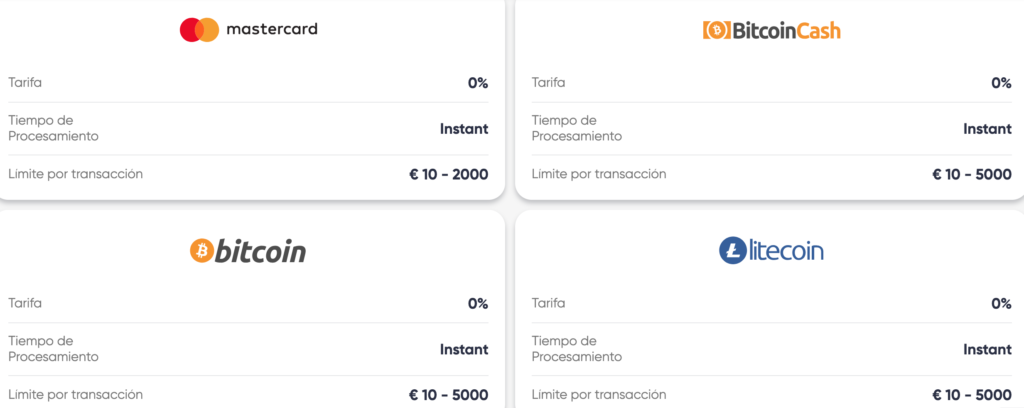 | Litecoin | Criptomoneda | 20 – 4,000 | 20 – 4,000 | Inmediato |